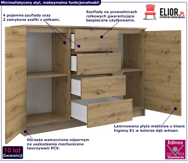 Szuflady na prowadnicach rolkowych gwarantują Ci wygodne i przede wszystkim bezpieczne użytkowanie komody. Bezuchwytowe fronty drzwiczek i szuflad podkreślają nowoczesny i modernistyczny styl mebla. Szlachetny kolor dąb artisan i prosta, współczesna forma nadają każdemu wnętrzu wyrafinowanej elegancji i "przemysłowego" charakteru. Z komodą marki Elior z łatwością uzyskasz wrażenie nieskrępowanej wolności i artyzmu, tak cenione w najmodniejszym stylu industrialnym.