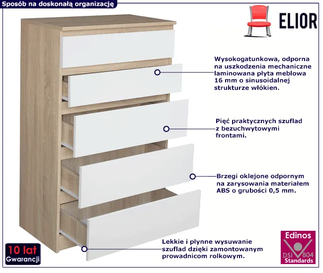 Każdy mebel marki Elior inspirowany jest Tobą. Tobą, Twoimi oczekiwaniami i potrzebami, z którymi spotykasz się każdego dnia. Właśnie dlatego zdecydowaliśmy się na zaproponowanie Ci komody Vinter 3X. To bardzo funkcjonalny mebel, który po prostu ułatwi Ci codzienne funkcjonowanie. Żebyś mogła cieszyć się nim przez długie lata, położyliśmy duży nacisk na jego jakość. To ona definiuje całą resztę. Dlatego też wykorzystaliśmy wysokiej klasy laminowaną płytę meblową o grubości 16 mm. Włókna wewnątrz niej ułożone są różnokierunkowo o strukturze sinusoidalnej, co wpływa na wytrzymałość mebla. Dodatkowo, płyta została uszlachetniona cienkimi filmami melaminowymi, które znacznie podnoszą jej trwałość i odporność na uszkodzenia. W końcowym procesie obrzeża komody zostały oklejone materiałem ABS o grubości 0,5 mm cechującym się wysoką odpornością na zarysowania.