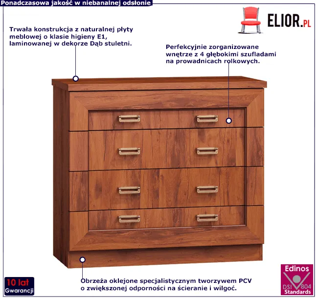 - Produkt posiada certyfikat jakości "Edinos Standards DSI 804", który potwierdza najwyższą jakość wykonania mebla oraz pełny stopień zgodności poszczególnych jednostek wytworzonego wyrobu z przyjętym wzorcem.