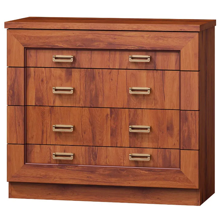 Komodę Lorines 2X zrobiliśmy z najwyższej jakości 16 mm laminowanej płyty meblowej o klasie higieny E1. Płyta charakteryzuje się ciekawą strukturą, która idealnie odwzorowuje naturalną fakturę i usłojenie drewna. Brzegi mebla zostały precyzyjnie oklejone specjalistycznym tworzywem PCV o zwiększonej odporności na ścieranie i wilgoć. Przestronne wnętrze komody zostało zorganizowane w wyjątkowo funkcjonalny sposób. 4 pojemne szuflady zapewniają sporo miejsca do przechowywania, a dzięki nowoczesnym prowadnicom kulkowym, ich otwieranie i zamykanie jest wyjątkowo wygodne i płynne. Tak wykonana komoda Lorines 2X marki Elior gwarantuje doskonałą jakość nawet po latach intensywnego użytkowani, a w dodatku fenomenalnie wystylizuje Twoje wnętrze!