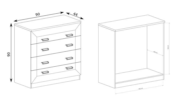 - Wymiary całkowite: wysokość: 90 cm, szerokość: 90 cm, głębokość: 44 cm.