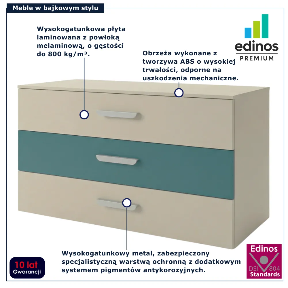 Komoda dziecięca z 3 szufladami Zimi 4X marki Edinos Premium to praktyczny wybór, który pomoże utrzymać porządek i stworzyć przyjazną, uporządkowaną przestrzeń dla dziecka. Solidne wykonanie, bezpieczna konstrukcja i ponadczasowy design sprawiają, że mebel doskonale sprawdzi się przez wiele lat użytkowania. To rozwiązanie, które rośnie razem z dzieckiem i dopasowuje się do zmieniających się potrzeb domowników. Wybierz komodę Zimi 4X i postaw na funkcjonalność oraz styl dostępne w atrakcyjnej cenie 568 zł.