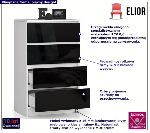 • Kolor: fronty w kolorze czarny - połysk oraz korpus w kolorze biały - mat. Kliknij w link i sprawdź także inne komody w sklepie Edinos.pl. Stwórz swój praktyczny zestaw mebli.