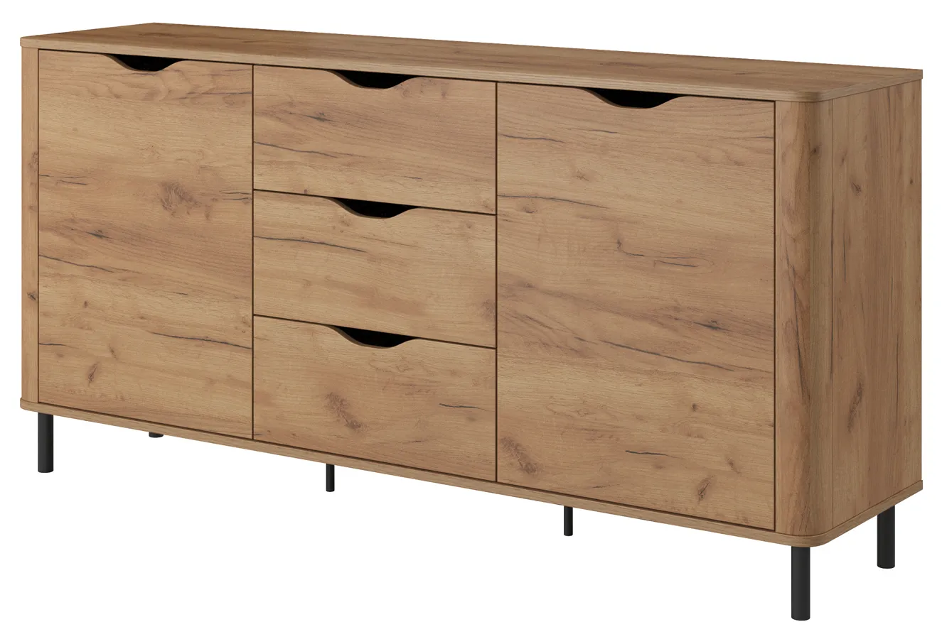 • Stylowe akcenty: Czarne metalowe nogi i frezowane uchwyty nadają meblom niepowtarzalnego charakteru z nutką modern retro.