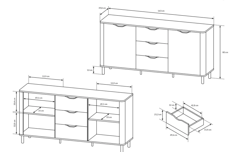 • Wymiary całkowite: wysokość: 80 cm, szerokość: 163 cm, głębokość: 39,8 cm