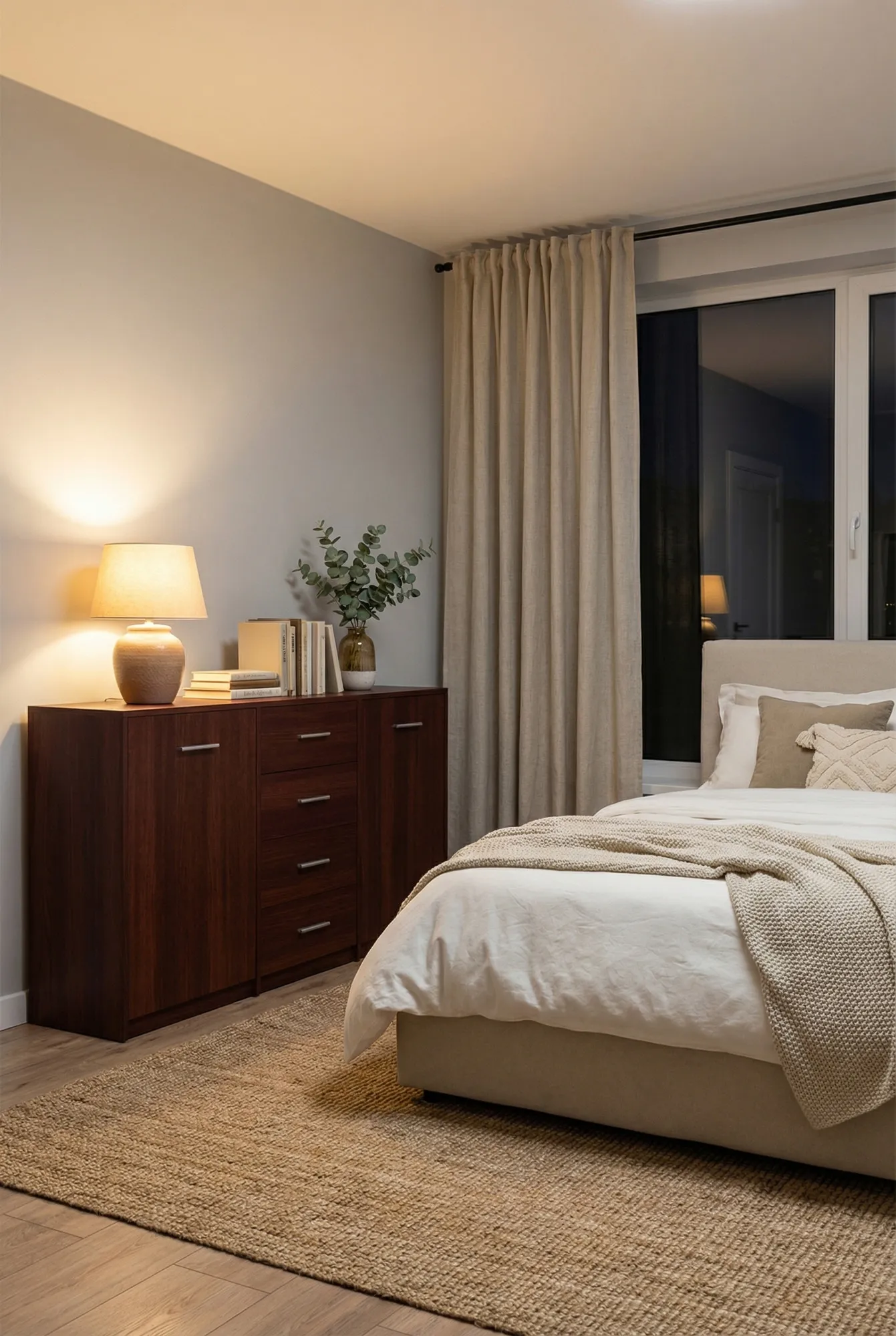 Aranżacja sypialni z komodą z szufladami i półkami wenge Cermesa 4X