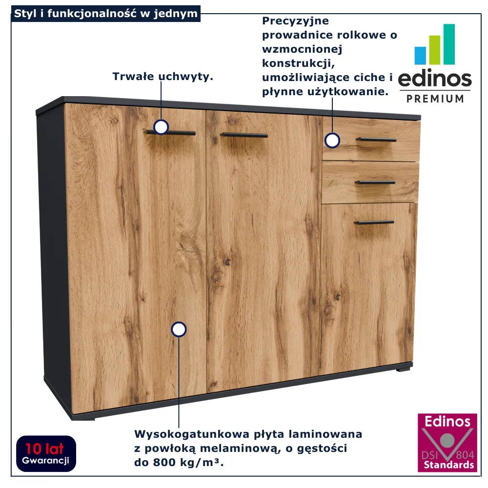 Jednym z najbardziej funkcjonalnych elementów tej serii jest komoda Asendri 4X marki Edinos Premium. To pojemny i przemyślanie zaprojektowany mebel, który łączy dużą przestrzeń zamkniętą z wygodnymi szufladami. Jej szeroka bryła doskonale sprawdzi się w salonie jako centrum przechowywania, w sypialni jako alternatywa dla klasycznej szafy pomocniczej, a nawet w jadalni czy przedpokoju. Prosty design sprawia, że komoda nie dominuje wnętrza, lecz subtelnie je uzupełnia, wprowadzając wrażenie porządku i harmonii.