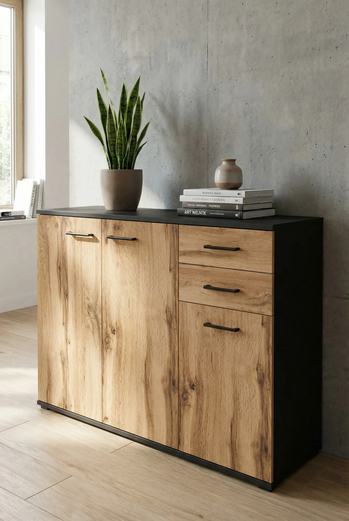 Wnętrze z wykorzystaniem komody z szufladami i półkami Asendri 4X grafit + dąb wotan
