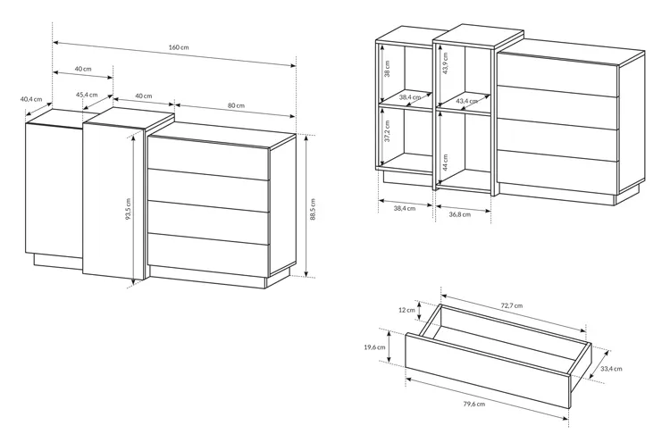• Wymiary całkowite: wysokość: 93,5 cm, szerokość: 160 cm, głębokość: 45 cm.
