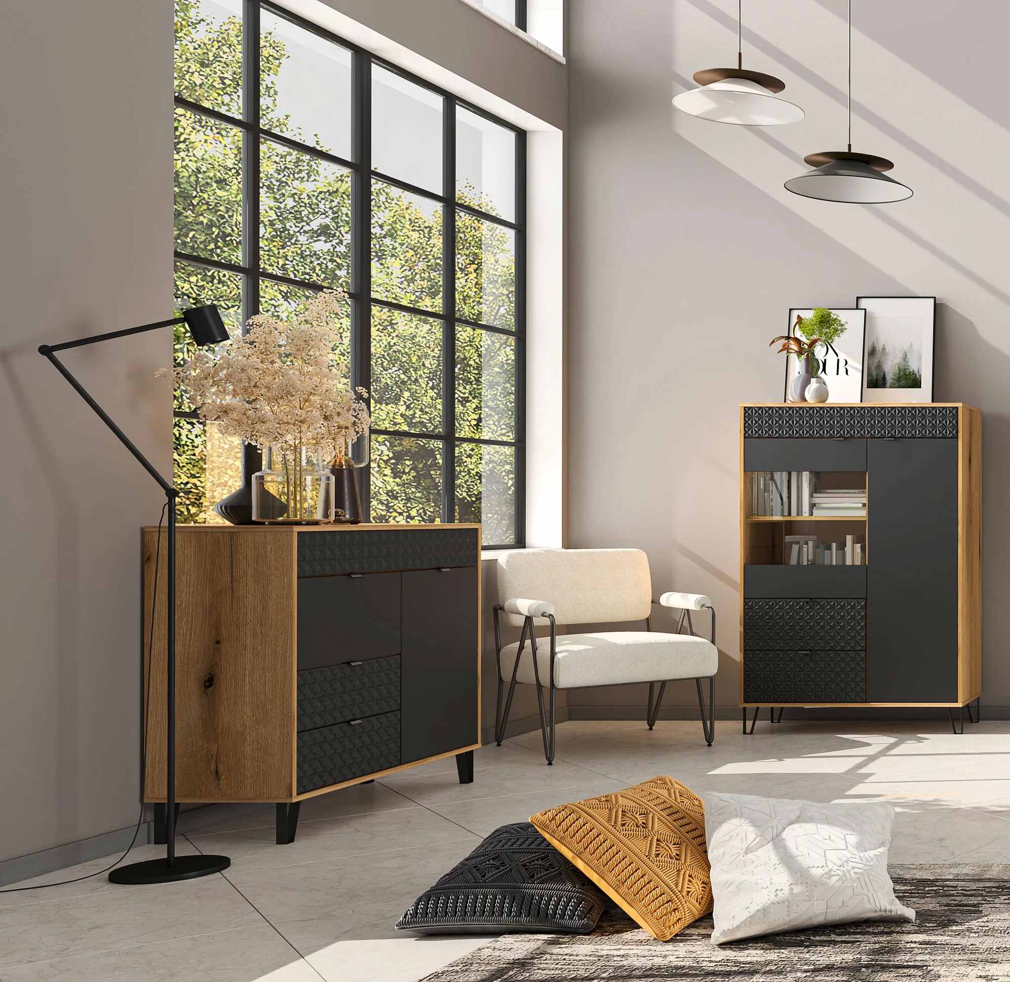 Przykładowa aranżacja z wykorzystaniem komody Eccio 3X dąb evoke czarny