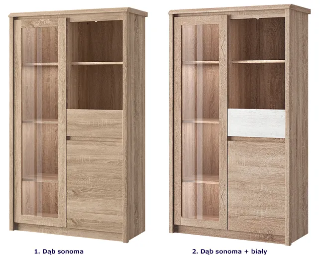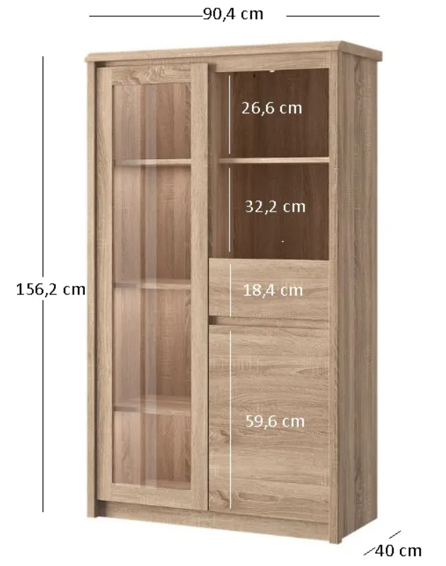 - Funkcjonalność: Przeszklona witryna, zamykana szafka, otwarte półki i szuflada gwarantują sporo miejsca na książki, szkło, porcelanę, dekoracje i bibeloty.