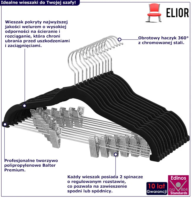 Zapewnij swojej garderobie najlepsze warunki przechowywania z zestawem 12 welurowych wieszaków z klamerkami Elda marki Edinos Premium. Te wyjątkowe wieszaki są nie tylko stylowe, ale także niezwykle funkcjonalne, idealnie nadające się do organizacji spodni, spódnic, koszul, krawatów i ciężkich garniturów. Dzięki welurowemu pokryciu, ubrania nie zsuwają się i są chronione przed zagnieceniami, a regulowane klamerki pozwalają na idealne dopasowanie do różnorodnych rozmiarów i typów odzieży.