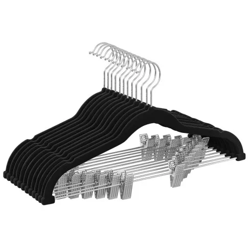 Komplet 12 czarnych wieszaków welurowych z klamerkami - Elda