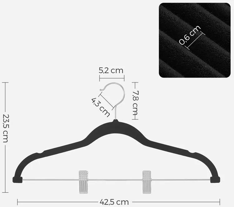• Profesjonalne tworzywo welurowe: zapewnia delikatność i trwałość, chroniąc ubrania przed uszkodzeniami.