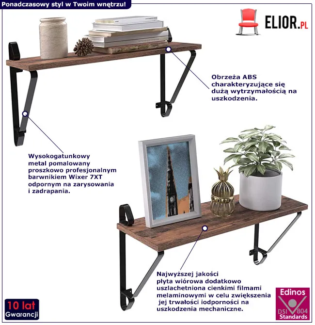 • Modny kolor: rustykalny brąz, czarny. W naszej ofercie posiadamy także inne półki ścienne. Kliknij i stwórz swój wyjątkowy zestaw mebli.
