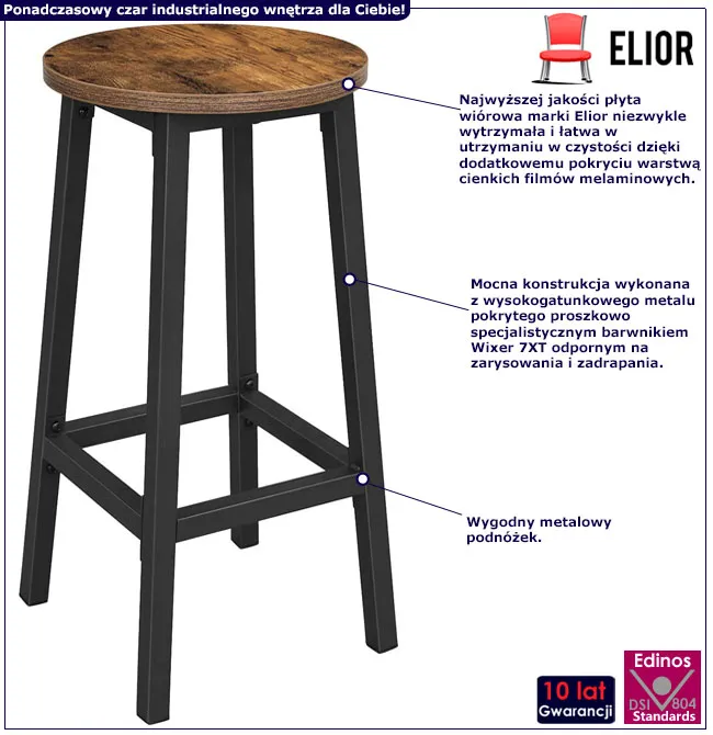 Konstrukcję dwóch wysokich taboretów kuchennych Burios 4X marki Elior wraz z praktycznym podnóżkiem wykonano z wysokogatunkowego metalu pokrytego proszkowo specjalistycznym odpornym na zarysowania i zadrapania. Natomiast siedzisko to najwyższej jakości płyta wiórowa marki Elior odporna na uszkodzenia mechaniczne. Pokrycie warstwą cienkich filmów melaminowych sprawiło, iż niezwykle łatwo utrzymać je w czystości. Modny kontrast rustykalnego brązu ze stabilnością metalu dodaje meblowi ponadczasowej elegancji.
