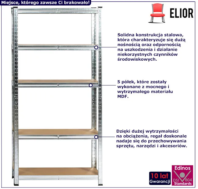• Wysokiej jakości metal odporny na zarysowania, zadrapania oraz korozję, co przekłada się na długą żywotność i estetyczny wygląd regału.