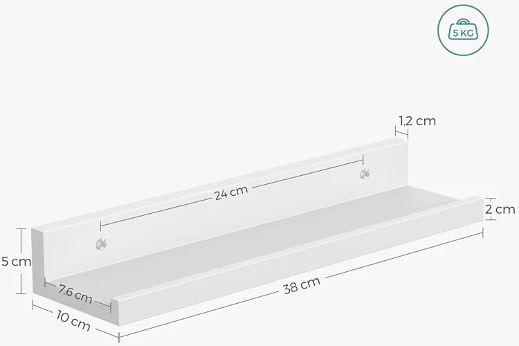• Wymiary każdej półki: szerokośc 38 cm, głębokość 10 cm, wysokość 5 cm