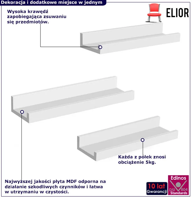 Marzysz o nowoczesnym wnętrzu, które zachwyca estetyką i funkcjonalnością? Zestaw trzech półek ściennych Soris marki Edinos Premium to idealne rozwiązanie dla każdego, kto ceni sobie porządek i styl. Wyjątkowa wydajność tych półek pozwoli Ci pięknie wyeksponować trofea, zdjęcia, świeczki, książki czy kwiaty doniczkowe, jednocześnie wprowadzając ład do każdego pomieszczenia. Dzięki ich uniwersalnemu designowi, doskonale wkomponują się w salon, przedpokój, sypialnię czy nawet biuro. Każdy element zestawu jest starannie dopasowany, nadając Twojemu wnętrzu nowoczesnego i eleganckiego wdzięku. Soris to nie tylko estetyka, ale również najwyższa jakość wykonania, która przyniesie satysfakcję na długie lata.