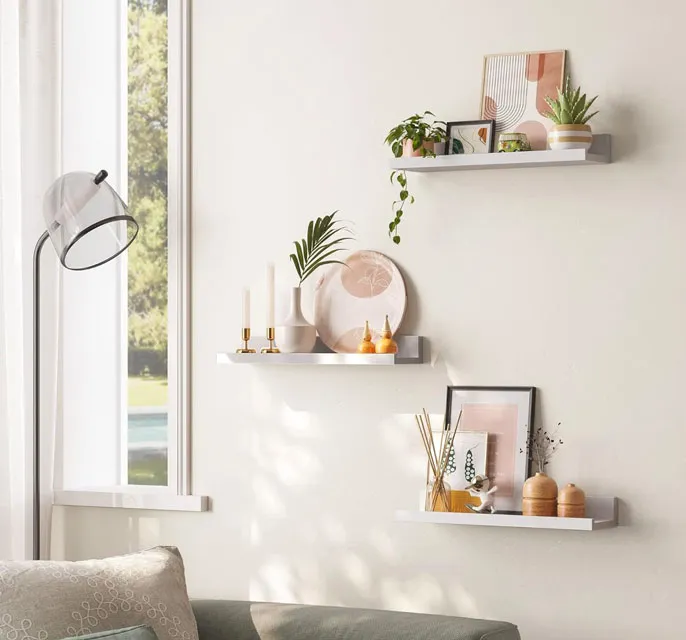 Salon z wykorzystaniem kompletu 3 białych półek ściennych Soris