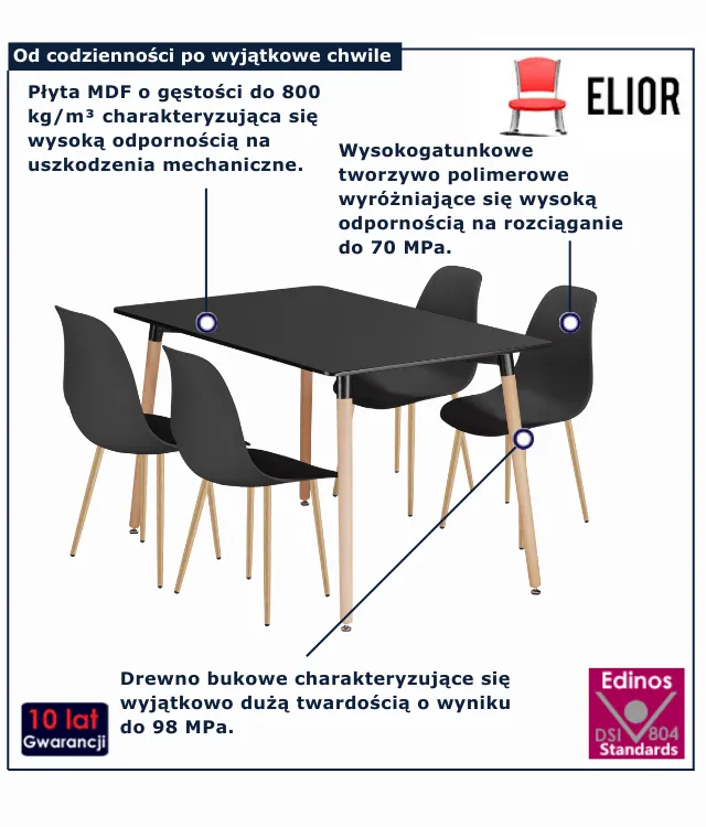 • Ergonomia i wygoda – profilowane siedziska krzeseł gwarantują komfort, a stół o idealnych wymiarach staje się miejscem wspólnych spotkań.