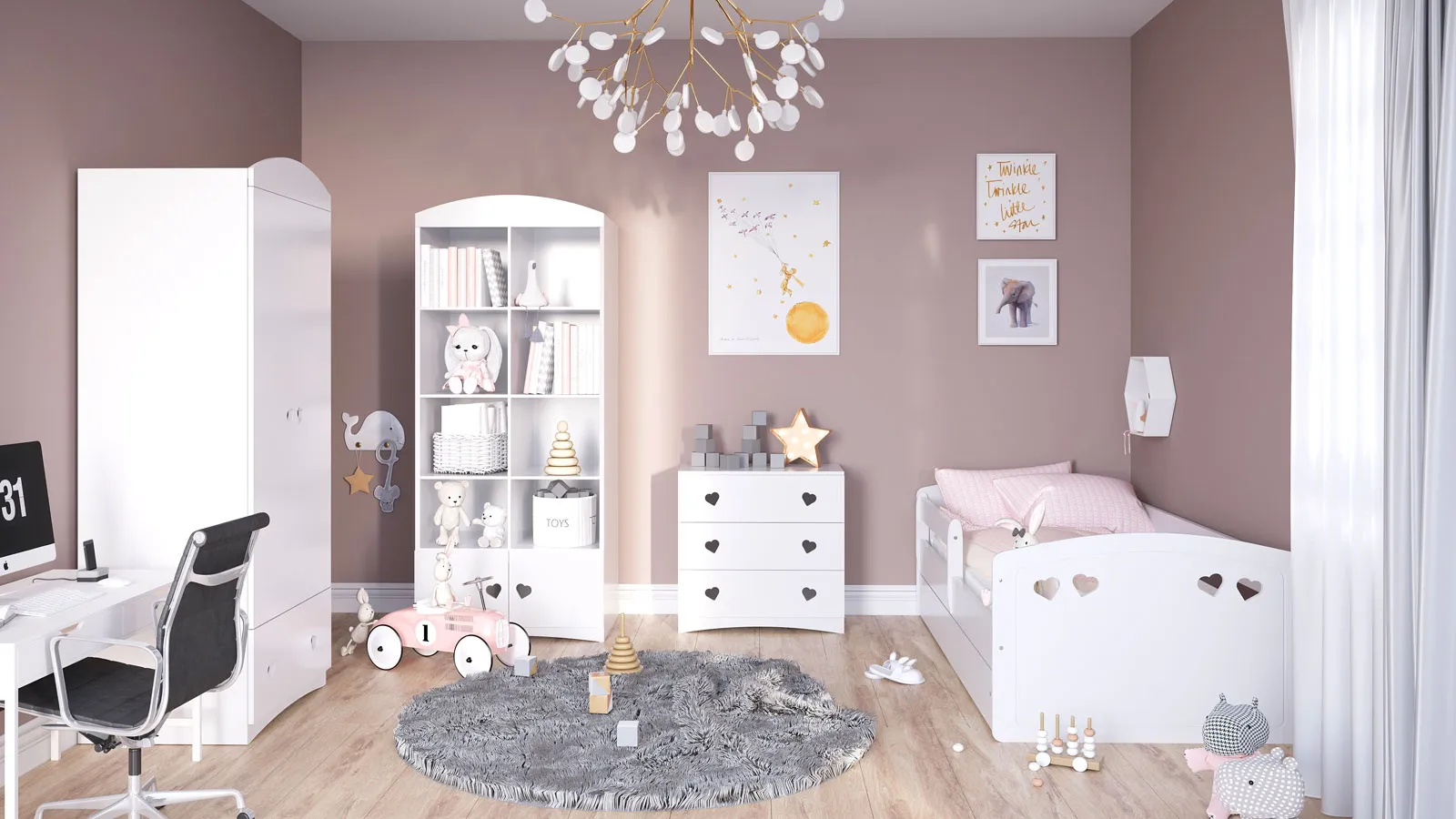 Z pewnością zależy Ci na tym by Twoja pociecha czuła się swobodnie, przytulnie i wygodnie w swoim pokoju. Wybrany przyjemny kolor ścian, więc teraz przyszła pora na kolejny krok, czyli zakup mebli. Przedstawiana przez nas propozycja to kolekcja, która z pewnością imponuje możliwością niezwykłej organizacji przestrzeni, zadbanie o poukładane ubrania oraz drobiazgi. W skład kolekcji wchodzi również regał, który elegancko zaprezentuje zabawki, książki lub ulubione dekoracje Twojego malucha. Przyjemna, biała kolorystyka uzupełniona o delikatny wzorek w kształcie serduszek to charakterystyczny detal, który łączy każdy z elementów kolekcji. Dzięki temu widać, że design pomieszczenia jest przemyślany i odpowiednio zaplanowany.