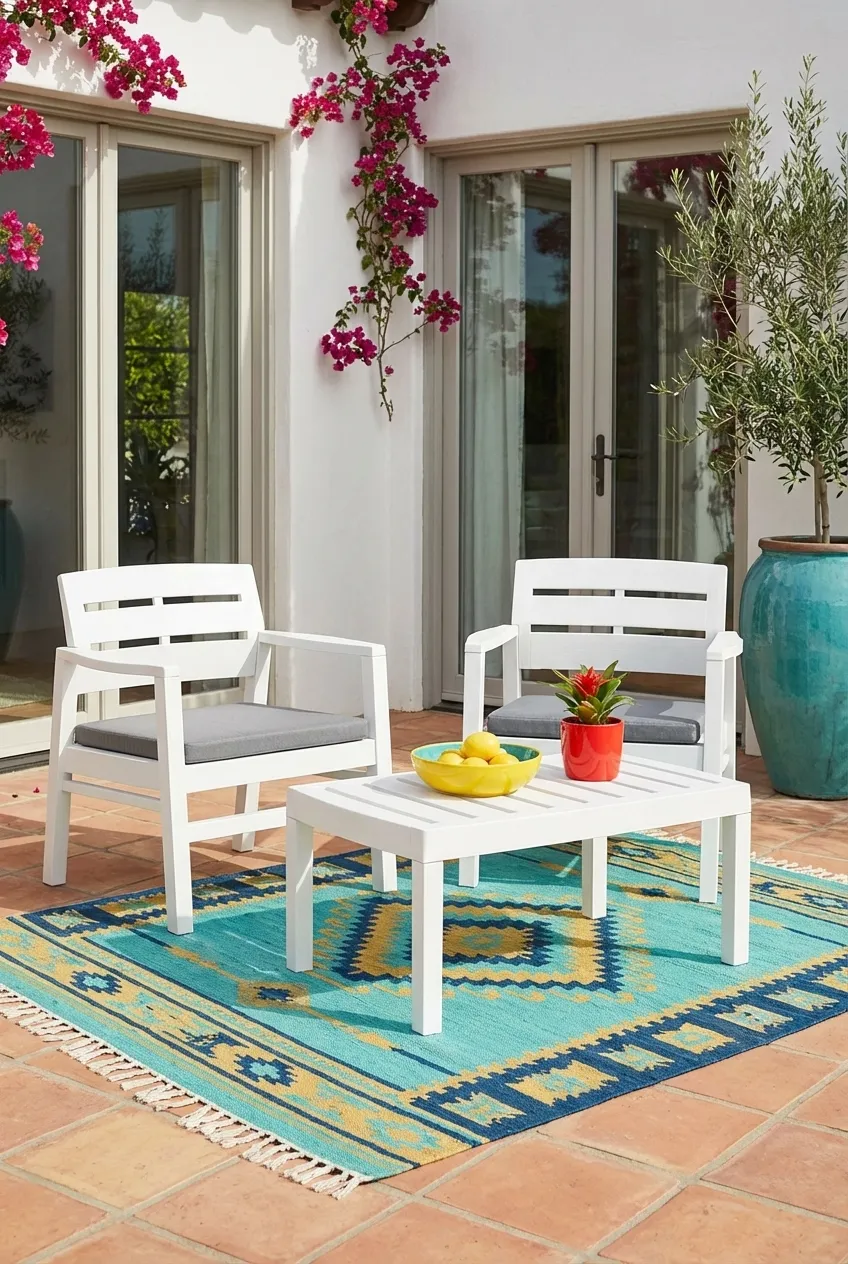 Komplet składa się z trzech części, które bez problemu złożysz nawet w kilka chwil. Wykonano je z tworzywa polimerowego najwyższej trwałości. Wszystkie elementy są wodoodporne, a dzięki inteligentnemu designowi nie osiada na nich kurz. Elastyczność struktury materiału sprawia, że pozostaje on trudny do uszkodzenia, natomiast użyte środki nie uczulają. Zestaw wyposażony jest również w dwie miękkie poduszki, przeznaczone na siedziska. Dostosowują się one do kształtu ciała, zwiększając tym samym komfort siedzenia. Emilly będzie więc idealnym wyborem, jeśli chodzi o relaks na świeżym powietrzu. Korzystając z niego, nie musisz martwić się o rozmaite czynniki atmosferyczne, jest bowiem odporny na działanie słońca, wiatru czy mrozu.