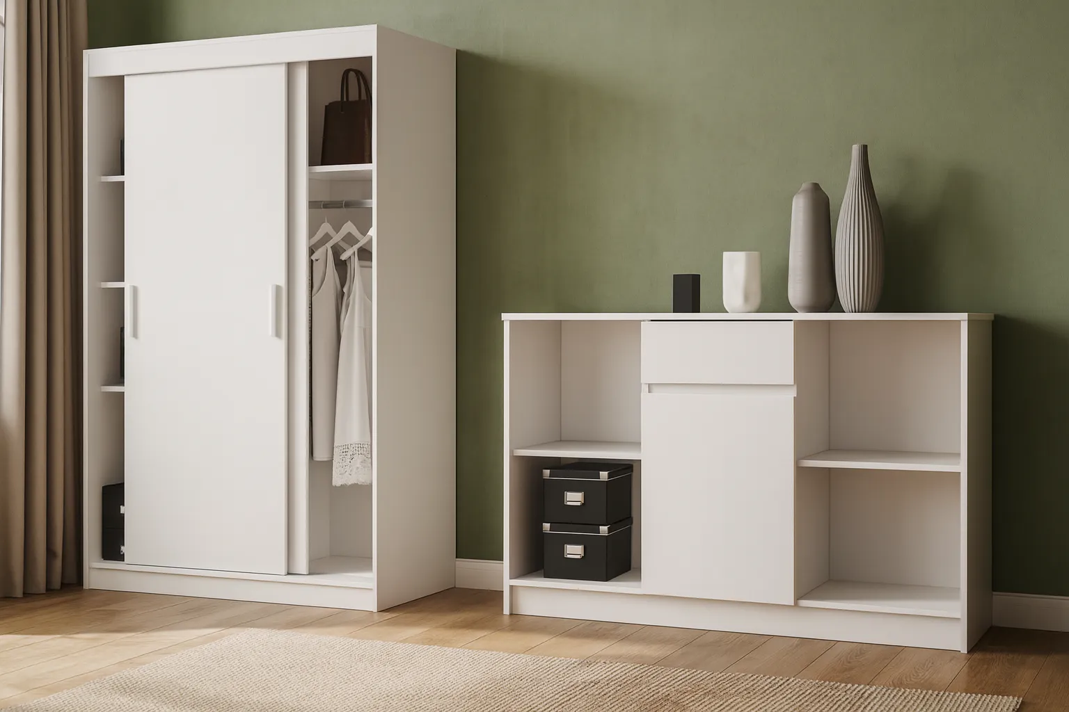 Magia kobiecej szafy: gdy chcesz włożyć do niej ubrania, to nie ma miejsca, a gdy chcesz coś założyć, to nie ma co... No cóż, tak to już jest z nami kobietami! Niektórzy lubią zbierać liście i je suszyć, drudzy lubią kolekcjonować książki kucharskie, a jeszcze inni uwielbiają wyszukiwać porcelanowe słonie z trąbą do góry... Ale jedno jest pewne - my kobiety najbardziej jednak lubimy ubrania! Nic tak nie podnosi na duchu, jak nowa para spodni albo letnia sukienka w kwiaty. Jest tylko jeden problem... Gdzie to wszystko pomieścić? Otóż mamy świetne rozwiązanie - zestaw składający się z komody oraz przesuwnej szafy Wertis marki Edinos Premium!