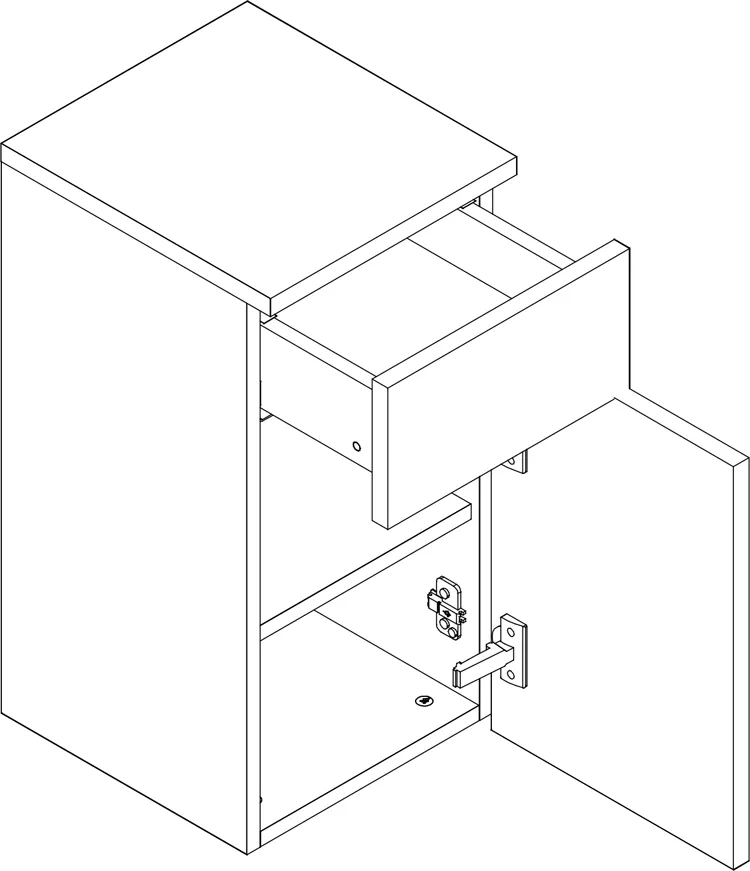 - Materiał: korpus: 16 mm laminowana płyta o klasie higieny E1, front: 19 mm foliowana płyta MDF.