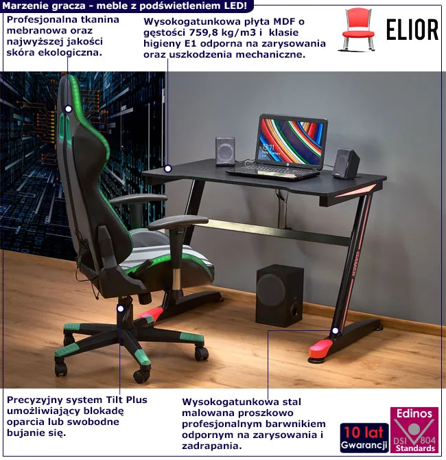 Odkryj zestaw biurko z fotelem obrotowym Lorient marki Edinos Premium, idealny dla młodego entuzjasty gier i technologii. Składający się z gamingowego biurka i fotela, ten komplet został zaprojektowany z myślą o potrzebach młodych graczy, łącząc w sobie nowoczesny design, ergonomię i najwyższą jakość materiałów. Biurko Lorient, wykonane z płyty MDF o klasie higieny E1 i wzmocnione filmami melaminowymi, jest odporne na zarysowania i uszkodzenia mechaniczne, zapewniając trwałość i estetykę. Fotel gamingowy, z tapicerką z profesjonalnej tkaniny membranowej i skóry ekologicznej, oferuje niezrównany komfort podczas długich sesji gier, a koła z tworzywa polimerowego gwarantują płynne i ciche przemieszczanie.
