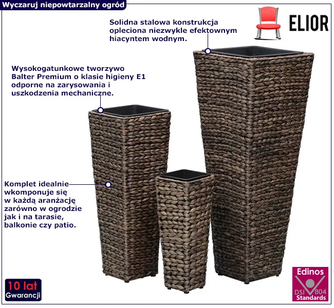 Odkryj magię natury i wprowadź jej urok do swojego otoczenia, dzięki zestawowi donic Lambi marki Edinos Premium. Zestaw trzech podwyższonych donic z hiacyntu wodnego oczaruje Cię swoją trwałością, urodą i możliwościami aranżacyjnymi. Teraz możesz stworzyć własny raj roślinny, bez względu na porę roku. Pozwól naturze wkraczać do Twojego domu, tarasu lub ogrodu za pomocą zestawu Lambi!