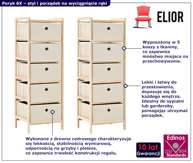 Witaj w świecie, gdzie natura i funkcjonalność idą w parze z niepowtarzalnym urokiem. Regał Galius 6X marki Edinos Premium to prawdziwy skarb dla każdego, kto ceni sobie rustykalny styl. Wyobraź sobie, jak lekki i łatwy do przenoszenia mebel, wykonany z litego drewna cedrowego, wnosi do Twojego wnętrza ciepło i przytulną atmosferę. Pięć kosze z tkaniny w jasnym kolorze, stanowiące szuflady, nie tylko dodadzą elegancji, ale także pomogą Ci w uporządkowaniu domowej przestrzeni. Ten regał to idealny sposób na zachowanie harmonii i estetyki w Twoim domu.