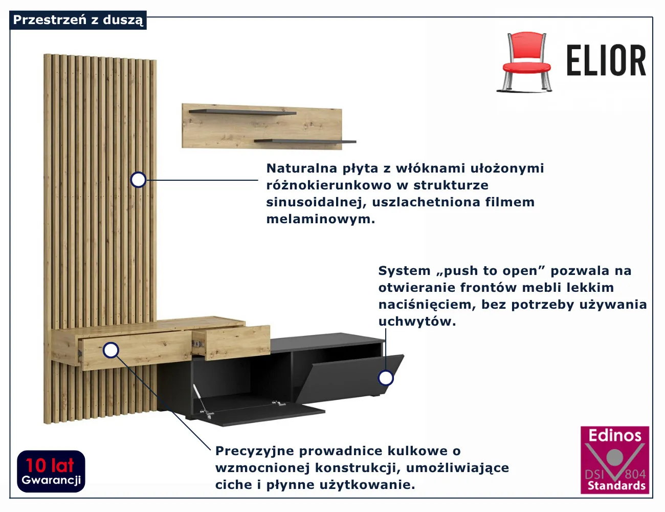 • Produkt posiada certyfikat jakości "Edinos Standards DSI 804", który potwierdza najwyższą jakość wykonania mebla oraz pełny stopień zgodności poszczególnych jednostek wytworzonego wyrobu z przyjętym wzorcem.