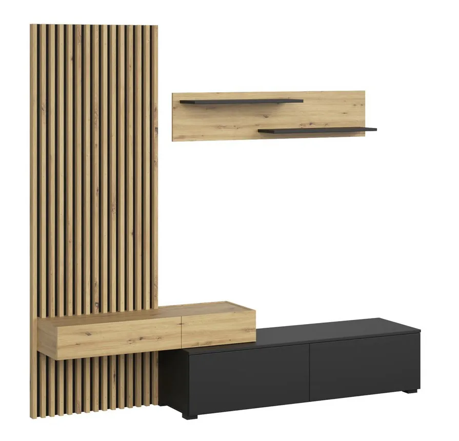 • Funkcjonalny układ – pojemna szafka RTV, elegancka półka wisząca i efektowny panel z lamelami tworzą spójną całość, idealną do nowoczesnego salonu.