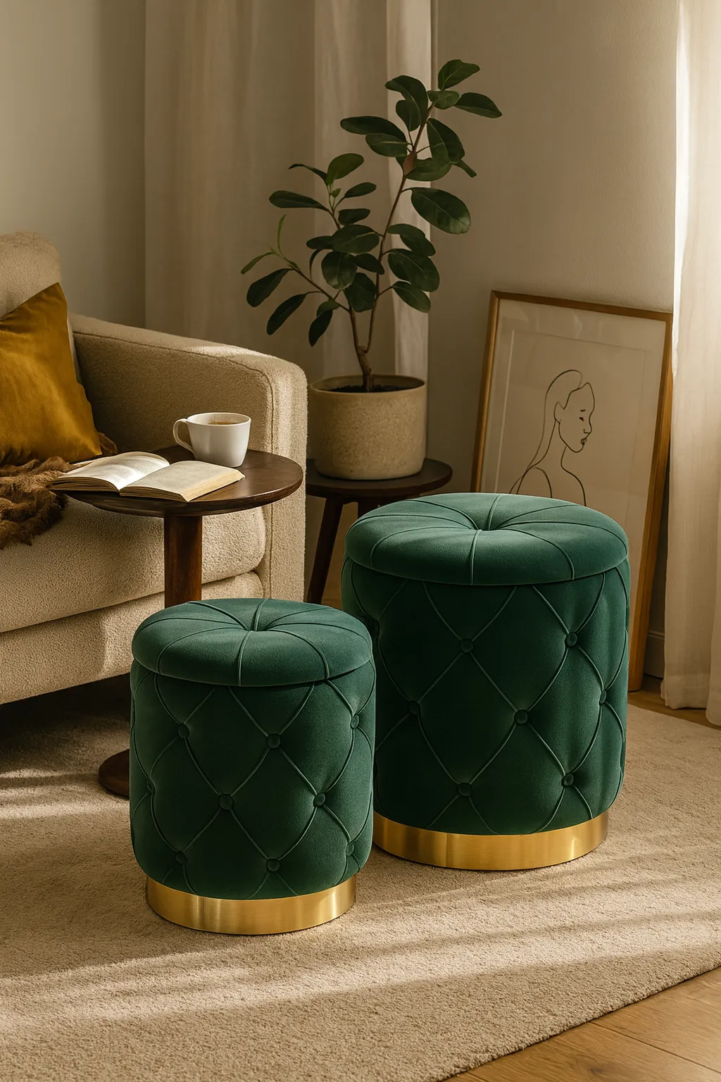 Glamour to modny trend w aranżacji wnętrz wywodzący się wprost ze złotej ery kina. Przepełniony jest blaskiem, wyrafinowaną elegancją i zamiłowaniem do odrobiny przepychu. Jego charakterystyczne cechy to luksusowe jedwabne i welwetowe tkaniny w nasyconych kolorach, stylowe pikowania, frędzle i wyrafinowane srebrne lub złote dodatki. Dzięki dodatkom właśnie możesz zamienić swój neutralny stylistycznie pokój w luksusowy salon niczym z hollywoodzkiego filmu. Zestaw welwetowych puf Hermos marki Edinos Premium to luksusowy dodatek meblarski o niesamowitych możliwościach stylizacyjnych. Szykowna tapicerka z welurowej tkaniny River w nasyconym odcieniu jadeitowej zieleni podkreślonym szykownymi pikowaniami została zestawiona z elegancką podstawą z chromowej stali nierdzewnej w kolorze złotym. Tak zaprojektowane pufy Hermos tworzą komplet meblowy o wyjątkowo bogatym, a jednocześnie wysmakowanym efekcie. Unikatowy design puf doskonale sprawdzi się w wielu aranżacjach, od glamour i boho, po wnętrza urządzone w stylu eklektycznym i klasycznym. Fantastycznie podkreśli charakter każdego wnętrza dodając mu wytworności i elegancji. W sypialni pufy Hermos będą tworzyły fantastyczny zestaw - siedzisko do toaletki i schowek na drobiazgi, nadając jej luksusowy charakter. Poza funkcją ozdobną komplet Hermos stanowi wyjątkowo praktyczny i funkcjonalny zestaw meblowy, który idealnie sprawdza się w niewielkich wnętrzach. Pufy będą pełnić funkcję dodatkowego miejsca do siedzenia i jednocześnie praktycznego schowka na drobiazgi. Większa z puf może także wystąpić w roli dodatkowego stolika - wystarczy postawić na niej tacę lub stabilną podstawkę, by zorganizować wygodne miejsce na przekąski i napoje podczas spotkania towarzyskiego. Pozwól sobie na odrobinę nostalgii. Kropelka elegancji, szczypta blasku i garść luksusu to idealny sposób na wnętrze w stylu złotej ery Hollywood.