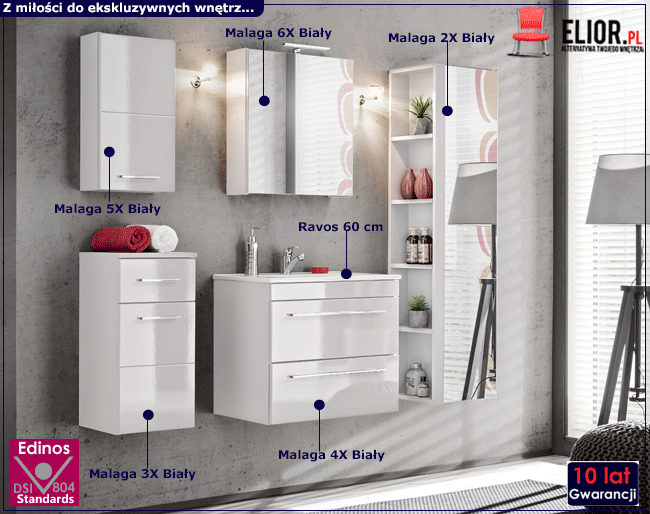 Zestaw wiszących mebli łazienkowych Malaga Biały połysk