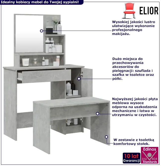 • Kolor: betonowa szarość. W naszej ofercie posiadamy także inne toaletki z krzesłami.