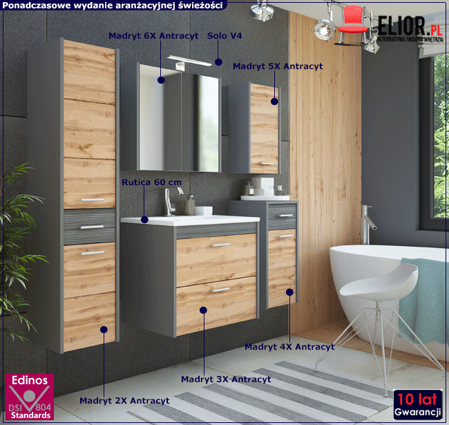 Madryt Antracyt to kolekcja, która powstała z myślą o osobach ceniących sobie przede wszystkim jakość na wysokim poziomie. Łazienka to wnętrze w którym jak wiemy powietrze jest wilgotne, dlatego też podczas doboru odpowiednich materiałów szereg specjalistów wyodrębniał te najlepsze, wyróżniające się trwałością oraz wysoką odpornością. W efekcie meble wykonane zostały z wysokogatunkowej płyty laminowanej o podwyższonej trwałości i gęstości. Płyta ta zbudowana jest z włókien drzewnych i związków organicznych w warunkach wysokiego ciśnienia i temperatury. Włókna ułożone są różnokierunkowo, o strukturze sinusoidalnej, co zapewnia nadanie jej cech jakościowych oraz wytrzymałościowych. Brzegi mebli oklejono specjalistycznym materiałem ABS, cechującym się ponadprzeciętną odpornością na zarysowania. Całość dzięki precyzyjnemu wykończeniu prezentuje się doskonale oraz zapewnia bezproblemowe i długoletnie korzystanie z mebli. Dzięki tej doskonałej kolekcji na długi czas zapomnisz o kolejnej wymianie mebli!