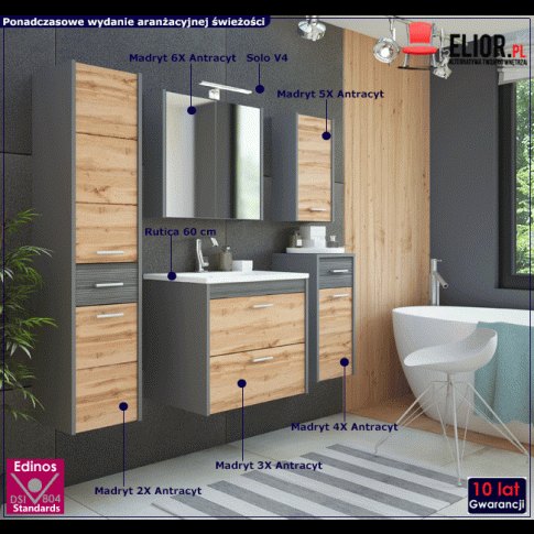 Kolekcja Madryt Antracyt to meble stworzone z prawdziwą pasją i zamiłowaniem. Designerskie połączenie antracytowego korpusu oraz frontów w kolorze Dąb Wotan tworzy nieoczywistą całość o wyjątkowym charakterze.  Ciemny korpus sprawia, że meble te zaskakują zdecydowaniem i elegancją, a drewniany dekor nadaje im szlachetności oraz wyjątkowej harmonii. Całość pozwala osiągnąć efekt wyjątkowo relaksującej przestrzeni kąpielowej. Klasyczne, nienachalne kształty sprawiają, że kolekcja Madryt jest lekka wizualnie. Meble posiadają profesjonalny system cichego domykania, dzięki czemu wystarczy lekko pchnąć front, a ten domknie się miękko i bezgłośnie sam. Podwieszana forma to kolejny atut tych mebli - nie przytłaczają dzięki temu aranżacji i ułatwiają utrzymanie czystości we wnętrzu. Meble z kolekcji Madryt Antracyt to propozycja dla miłośników zdecydowanych, loftowych wnętrz. Doskonale odnajdą się w stylu industrialnym, nowoczesnym, a nawet skandynawskim i bez wątpienia zadowolą nawet najbardziej wymagających!