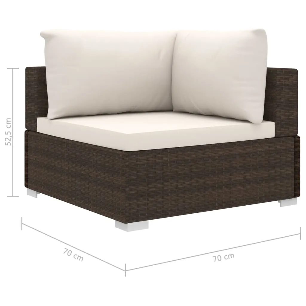 - Wymiary stolika: długość – 74 cm, szerokość – 74 cm, wysokość – 26 cm - Wymiary narożnej sofy: szerokość – 70 cm, głębokość – 70 cm, wysokość – 52,5 cm - Wymiary środkowej sofy: szerokość – 70 cm, głębokość – 70 cm, wysokość – 52,5 cm - Wymiary podnóżka: długość – 70 cm, szerokość – 70 cm, wysokość – 26 cm - Grubość poduszki: 6 cm - Materiał: malowana metodą proszkową rama ze stali, odporny na wpływ czynników atmosferycznych polirattan, blat z hartowanego szkła, poliestrowe poszewki. - Kolor: brązowy, kremowe poduszki. Kliknij w link i sprawdź także inne zestawy ogrodowe w sklepie Edinos.pl. Stwórz swój praktyczny zestaw mebli. - Produkt posiada certyfikat jakości "Edinos Standards DSI 804", który potwierdza najwyższą jakość wykonania mebla oraz pełny stopień zgodności poszczególnych jednostek wytworzonego wyrobu z przyjętym wzorcem. - Bardzo łatwy montaż (w zestawie znajduje się czytelna i dokładna instrukcja montażu mebla). - Gwarancja 10 lat (inni producenci oferują maksymalnie 24 miesiące gwarancji. Tylko u nas otrzymujesz pełną jakość potwierdzoną aż 10-letnią gwarancją)!