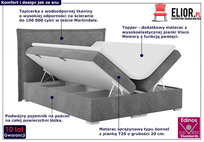 - Łóżko wyposażone jest w podwójny pojemnik na pościel, wysokiej jakości materac bazowy typu bonell z pianką T 25 o grubości 20 cm i Topper z pianki Visco Memory o grubości 5 cm.