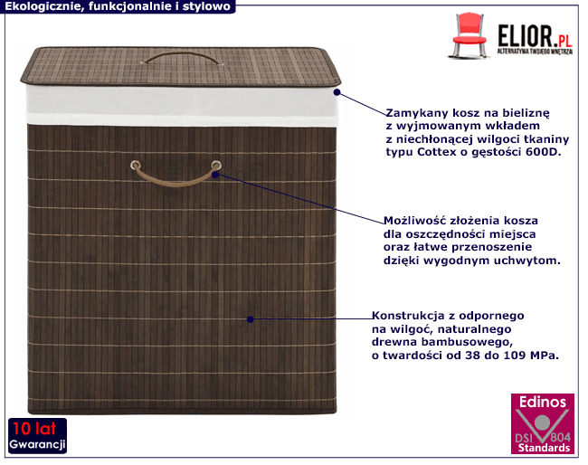 - Modny kolor: Ciemnobrązowy. Szukasz innego kosza na pranie? Sprawdź kosze na bieliznę w sklepie Edinos.pl. Stwórz własny zestaw do przechowywania prania!
