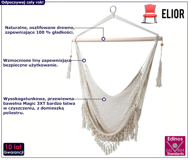 Zapraszamy do świata wyjątkowego uroku stylu boho z krzesłem brazylijskim Nodris marki Elior. To niezwykłe krzesło o ażurowym splocie w delikatnym odcieniu ecru, które przeniesie Cię w podróż do egzotycznych zakątków Brazylii. Krzesło brazylijskie Nodris to doskonała alternatywa dla tradycyjnego hamaka, na którym równie przyjemnie można się zrelaksować. Idealne miejsce do odpoczynku, czytania książki czy delektowania się kawą na świeżym powietrzu. Dzięki niewielkim wymiarom, krzesło Nodris bez trudu zawiesisz w pomieszczeniach, na balkonie czy w ogrodzie. Jego składana konstrukcja sprawia, że łatwo przechowasz je, gdy nie jest potrzebne.