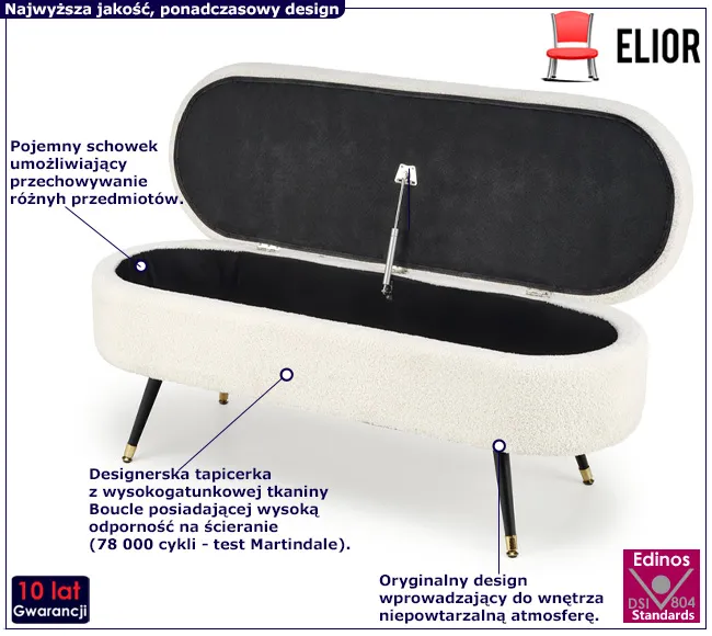 Jesteś zwolennikiem praktycznego wypełniania przestrzeni w mieszkaniu? Lubisz, gdy coś co kupujesz ma więcej funkcji niż tylko jedną? Poznaj ławkę Olvero marki Elior, która jednocześnie będzie pełniła funkcję siedziska i pojemnej przestrzeni do przechowywania. Jesteśmy pewni, że spełni Twoje oczekiwania! To wyjątkowe rozwiązanie, które łączy w sobie elegancki design i funkcjonalność. Przygotuj się na unikalny element wystroju wnętrza, który odmieni Twoje codzienne życie.