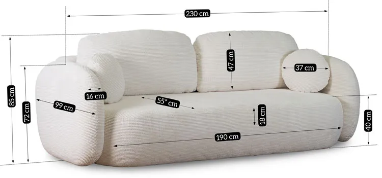 • Wymiary całkowite: długość: 230 cm, szerokość: 99 cm, wysokość: 85 cm.
