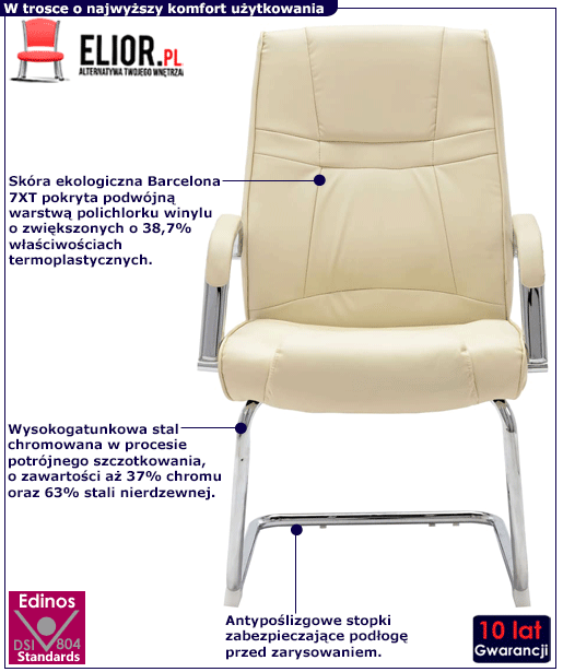 Krzesło Mindy 2X to mebel skonstruowany do pracy. Jego przeznaczeniem jest troska o zdrowie oraz zapewnienie komfortu osobie zajmującej na nim miejsce. Dzięki temu, że krzesło Mindy 2X umieszczone zostało na metalowych wspornikach pozwala na swobodne bujanie się inaczej "efekt kołyski" (idealny na przerwę w pracy oraz relaks). To niezwykle wygodne i bardzo zdrowe rozwiązanie, które odpręża kręgosłup oraz zwalnia napięcie w Twoich udach! Stabilny profil wykonany został z najwyższej jakości stali chromowanej o zawartości aż stali nierdzewnej oraz chromu, co gwarantuje mu niezwykły efekt wizualny, posiadając przy tym ponadprzeciętne cechy antykorozyjne oraz lepszą odporność na uszkodzenia mechaniczne . Designerska tapicerka w kolorze subtelnego kremu pokryta została najwyższej jakości ekoskórą (skórą ekologiczną), łatwą do utrzymania w czystości (co jest szczególnie istotne w przypadku produktów wykorzystywanych podczas spożywania posiłków). Ekoskóra używana przy produkcji mebli marki Elior jest o wiele bardziej odporna na słońce oraz substancje płynne , co pozwala Ci na długie i bezpieczne użytkowanie. Plama po porannej kawie lub przyjęciu z czerwonym winem nie spowoduje już więcej konieczności wymiany tapicerki. Stwórz idealne miejsce pracy z wspaniałym krzesłem konferencyjnym Mindy 2X i ciesz się doskonałymi efektami pracy!