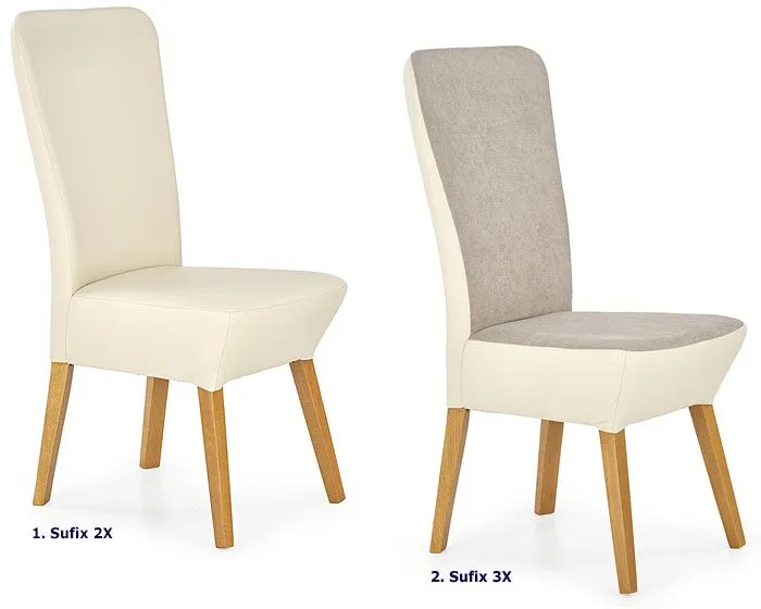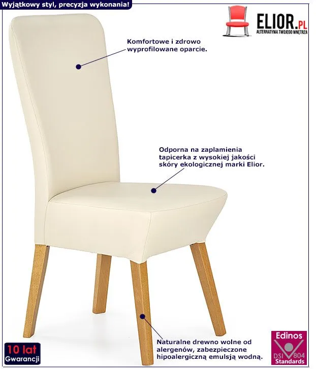 Oryginalne i komfortowe krzesło Ondario 2X wyróżnia się nie tylko swoją unikalną formą, ale także zastosowaniem materiałów najlepszej jakości. Designerska tapicerka mebla w kolorze kremowym pokryta została najwyższej jakości ekoskórą (skórą ekologiczną), łatwą do utrzymania w czystości (co jest szczególnie istotne w przypadku produktów wykorzystywanych podczas spożywania posiłków). Ekoskóra używana przy produkcji mebli marki Elior jest o wiele bardziej odporna na słońce oraz substancje płynne , co pozwala Ci na długie i bezpieczne użytkowanie. Już nie musisz się martwić, że rozlana kawa spowoduje konieczność wymiany mebla. Skóra ekologiczna została pokryta warstwą polichlorku winylu. Profil mebla w kolorze dąb miodowy stworzony został z naturalnego drewna wolnego od alergenów, a następnie zabezpieczonego hipoalergiczną emulsją wodną. Stonowana kolorystyka i prosta forma sprawiają, że krzesło doskonale odnajduje się we wnętrzach urządzonych w stylu skandynawskim, jak też minimalistycznym czy nowoczesnym. Sufix z powodzeniem sprawdza się także jako wygodny fotel do biurka. Krzesło marki Elior zapewnia Ci niezapomniane chwile przy stole w gronie przyjaciół i rodziny. Wnieś do swojego wnętrza nastrojowy klimat, harmonizując go z ciepłem naturalnych barw!