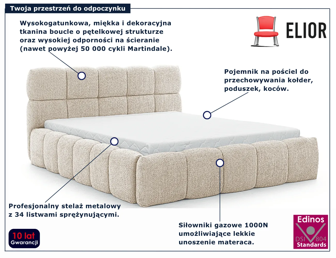 • Siłowniki gazowe o mocy 1000N umożliwiają lekkie i płynne unoszenie materaca, ułatwiając dostęp do pojemnika na pościel.