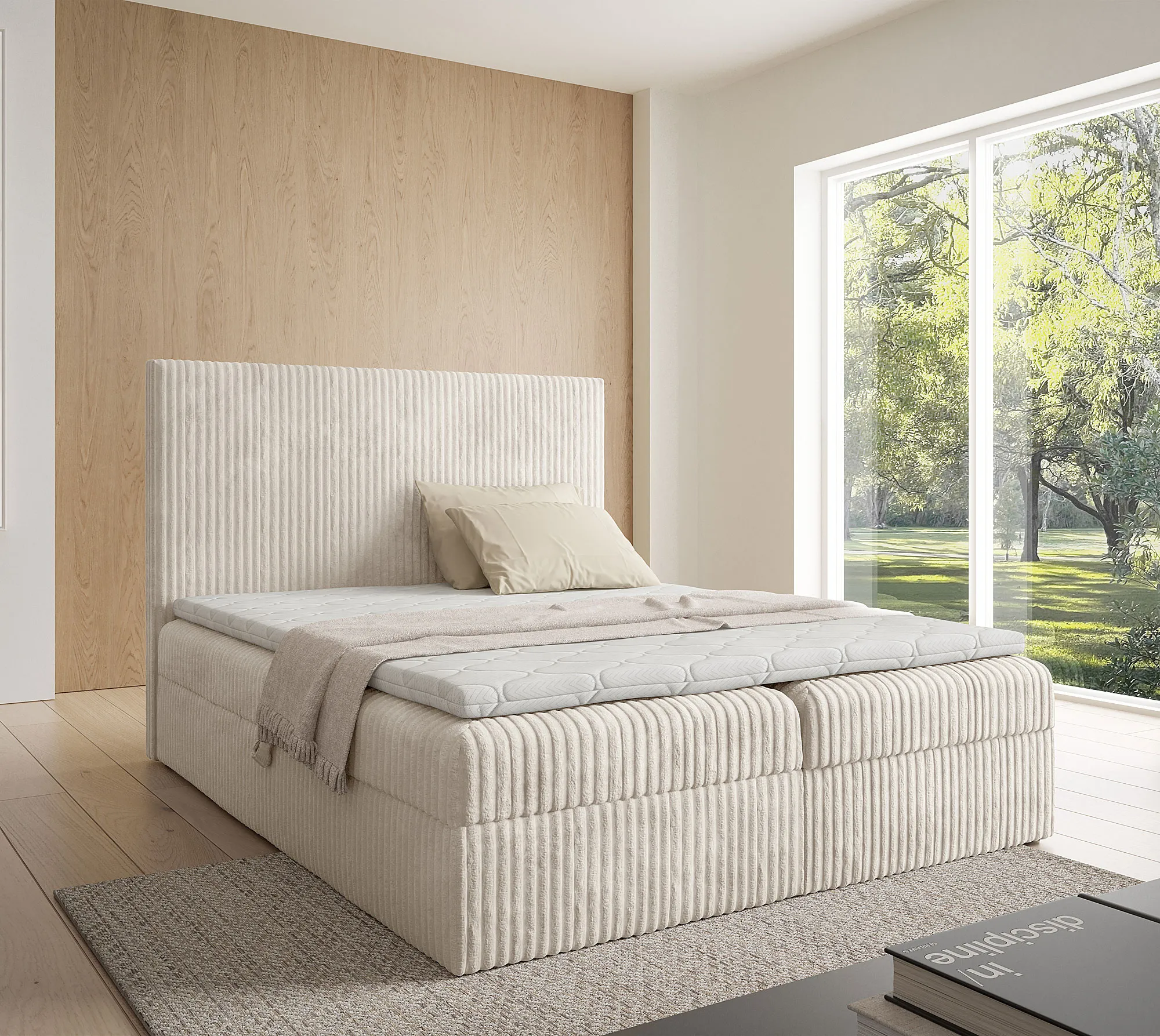 Aranżacja wnętrza z kremowym łóżkiem Masseno