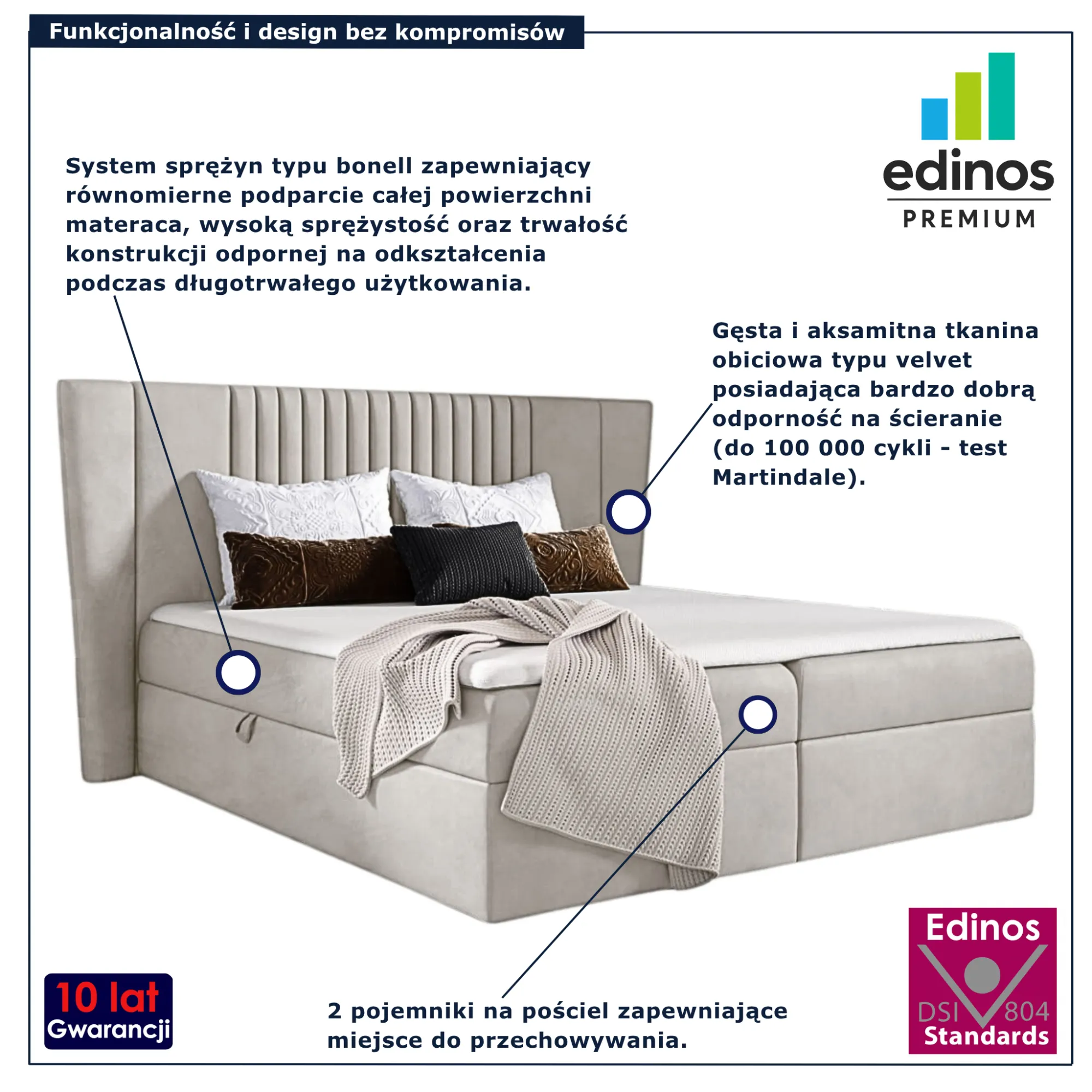 • Produkt posiada certyfikat jakości "Edinos Standards DSI 804", który potwierdza najwyższą jakość wykonania mebla oraz pełny stopień zgodności poszczególnych jednostek wytworzonego wyrobu z przyjętym wzorcem.